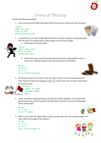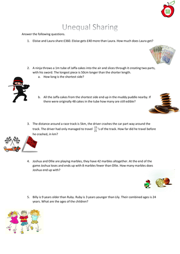 For more resources involving word problems click here. I was looking for a resource to assist my 11 plus students with unequal sharing and could not find anything so I decided. Unequal sharing means that you share a number of items between two or more people but in such a manner that one or more person gets a bigger share than the others.